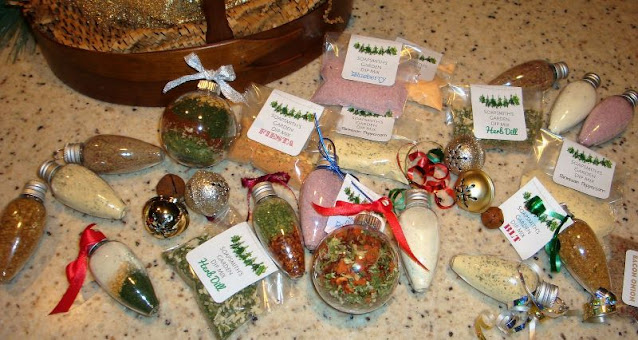 I packed some in clear cello bags with tags and did a few in cute Christmas ornaments. You can find the fillable ornaments and bulb shapes at the craft stores. If you don't find ones with regular screw top lids, you can use plastic ornaments, just be sure to cover the hole with a piece of foil before replacing the cap.